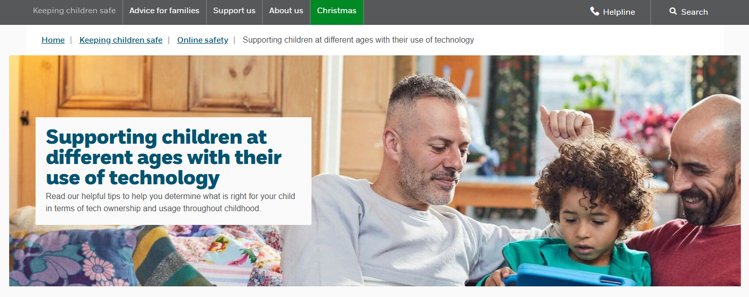 A link to NSPCC's website page; 'Supporting children at different ages with their use of technology'. This is a page full of tips on setting privacy controls, online safety conversation starters, how to establish healthy online habits and links to other pages such as 'Is your child ready to have their own phone?'.