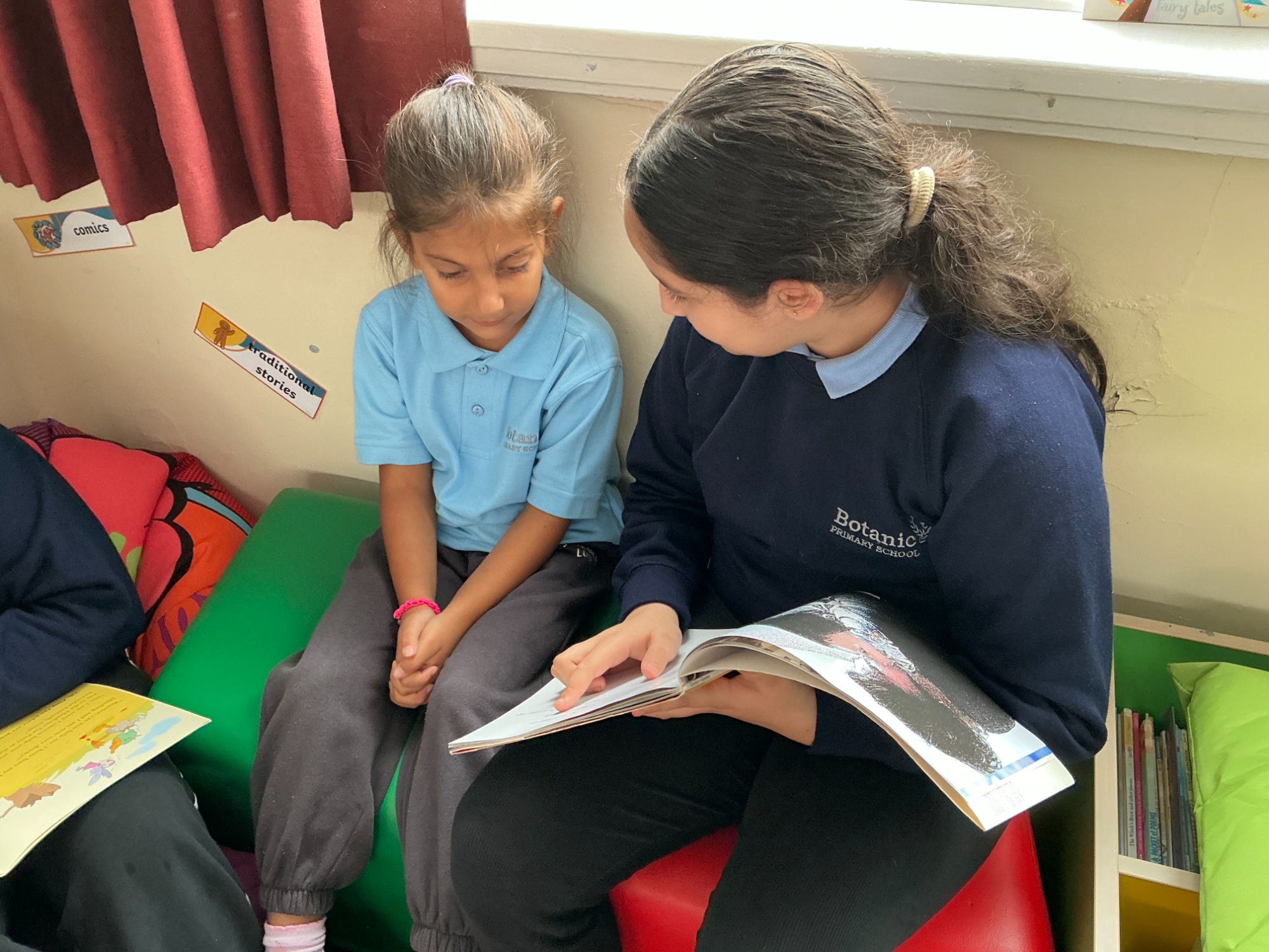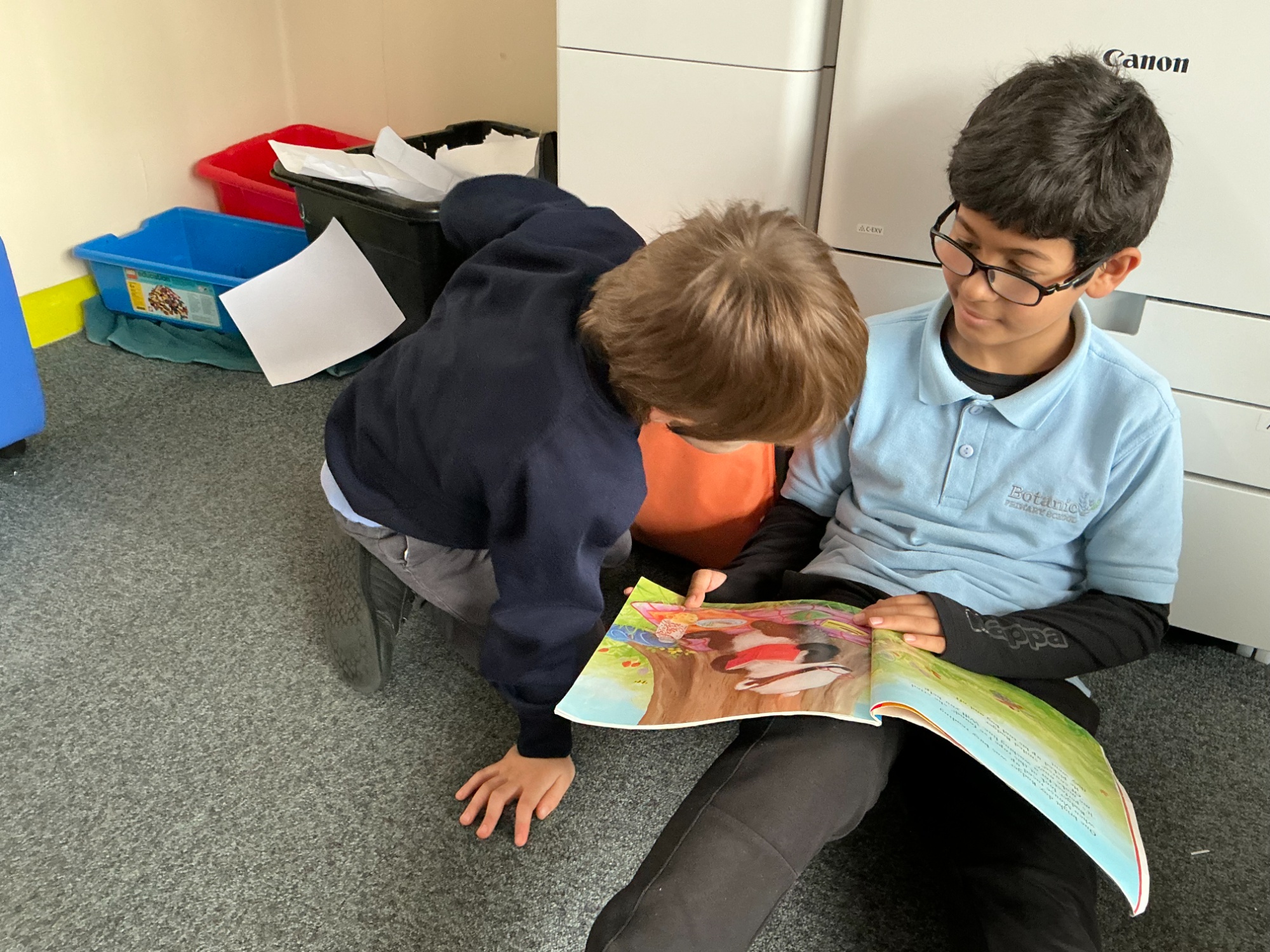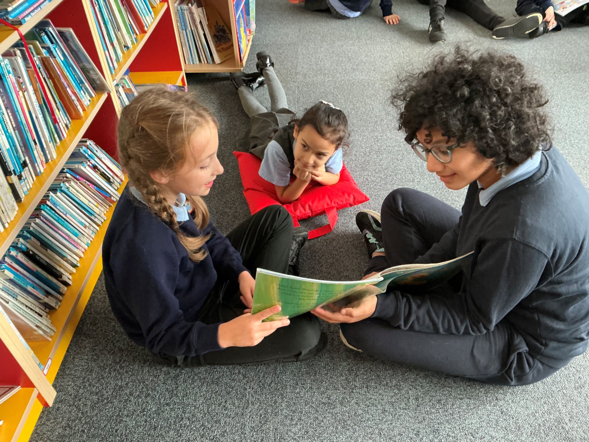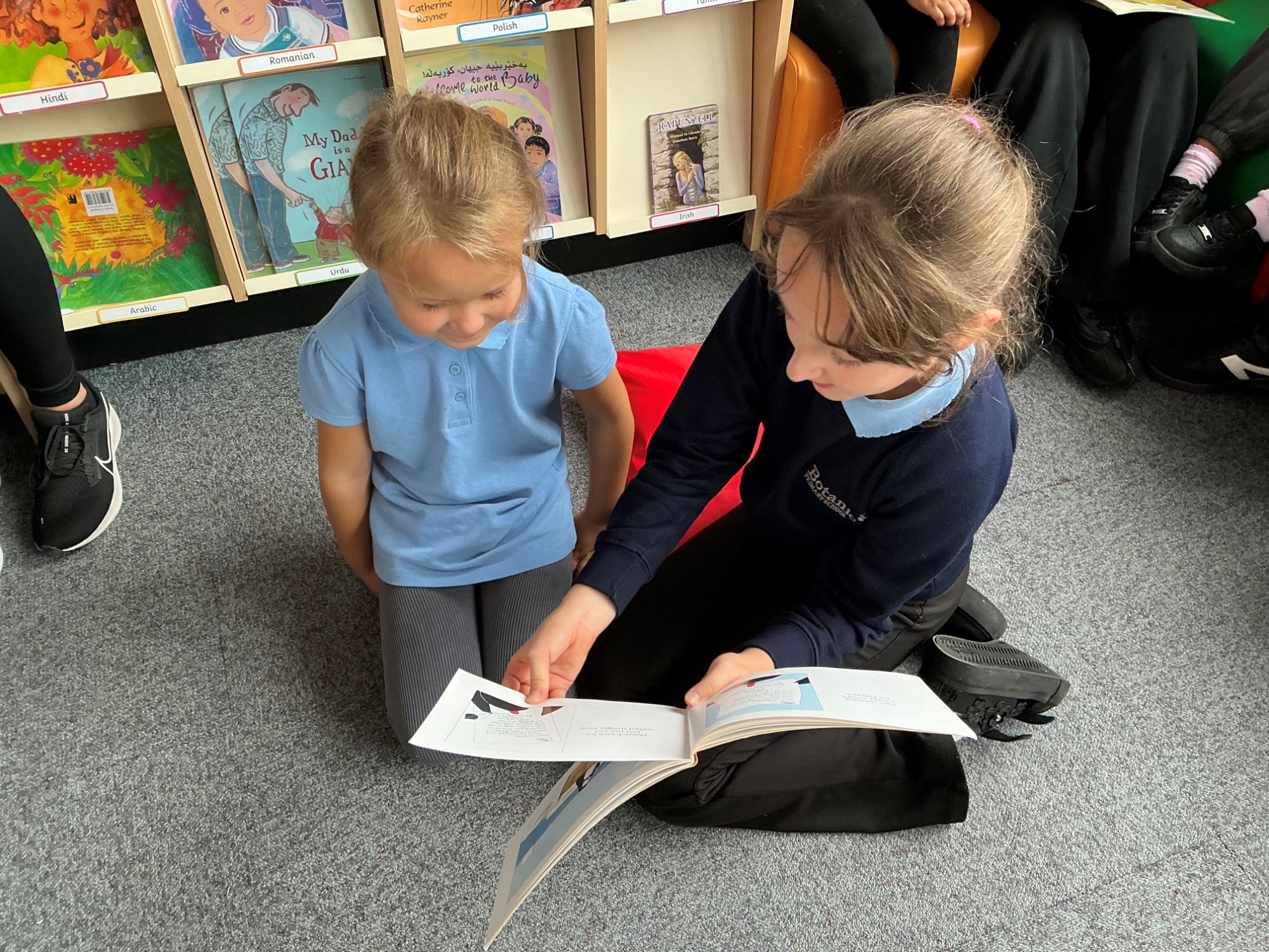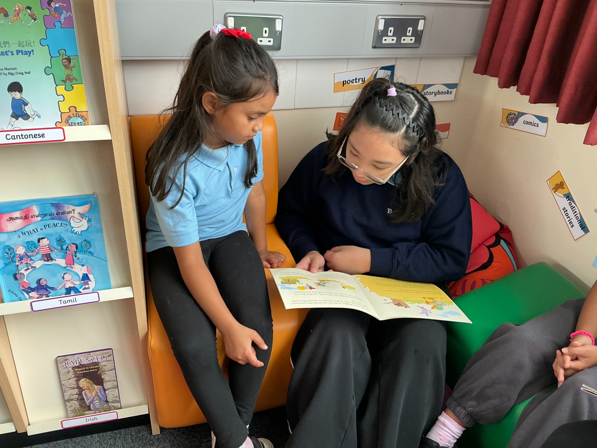 Once per half-term, we meet with our reading partners. The older pupils read to our younger pupils in the library.  This is a special time to share a book and make new friends.