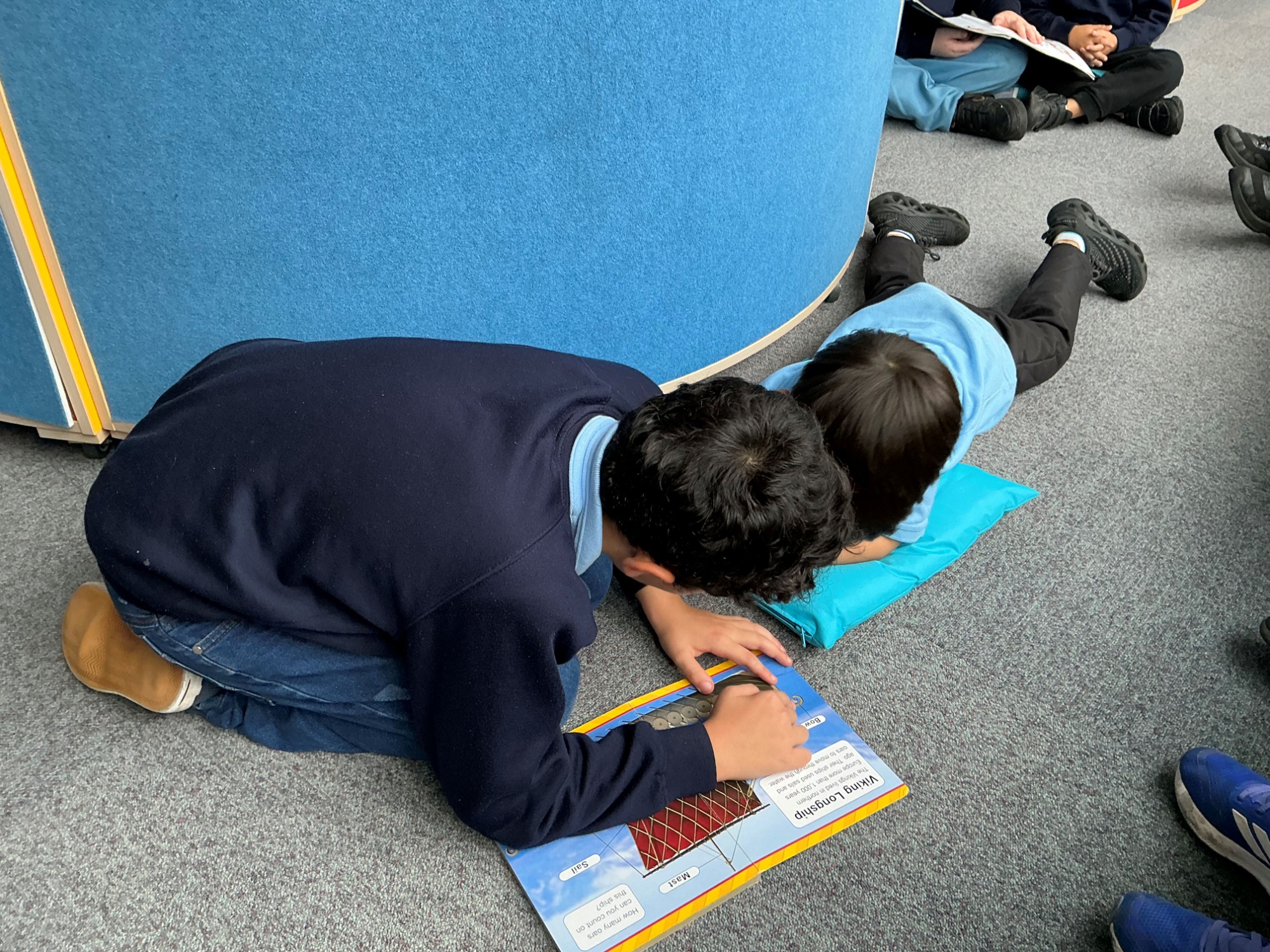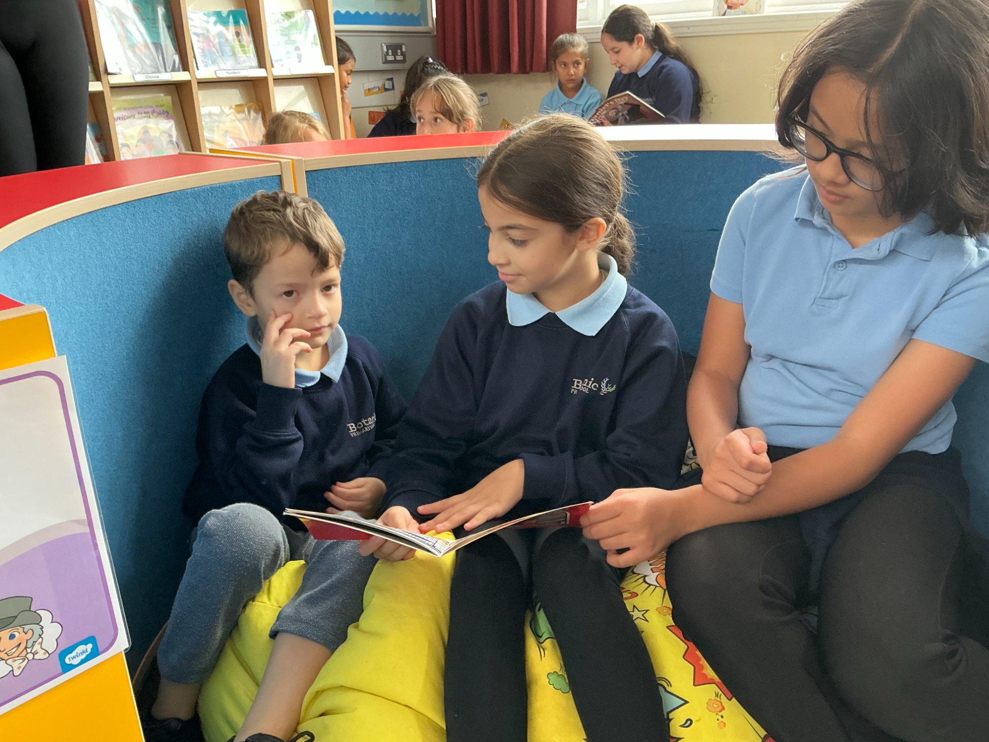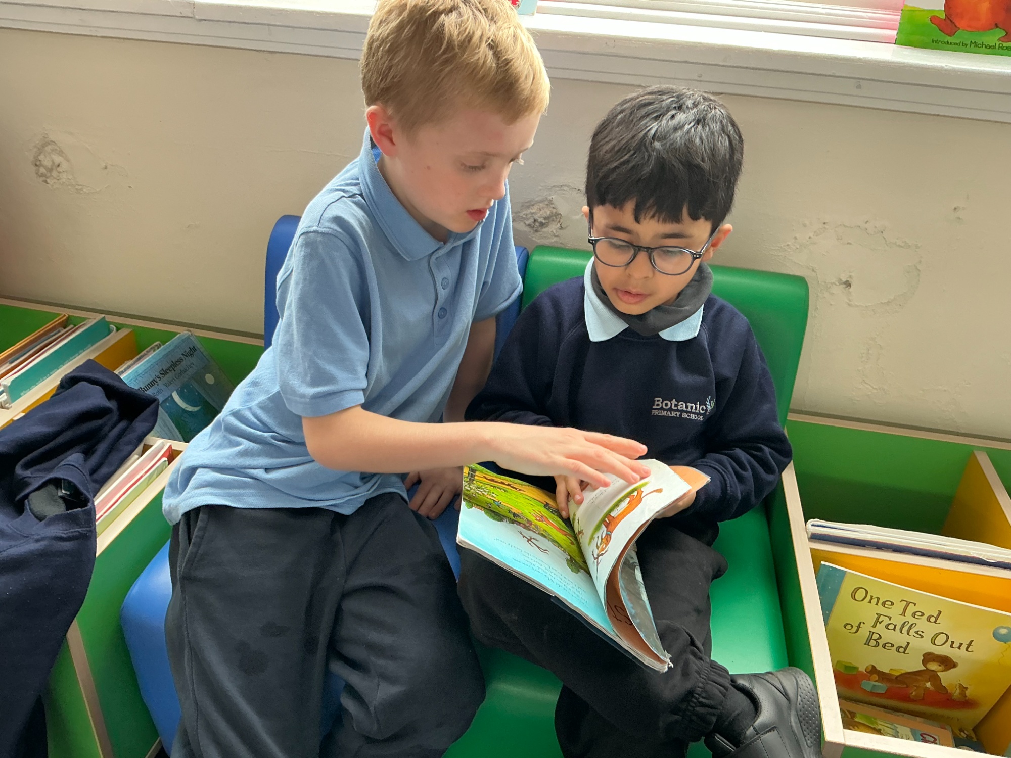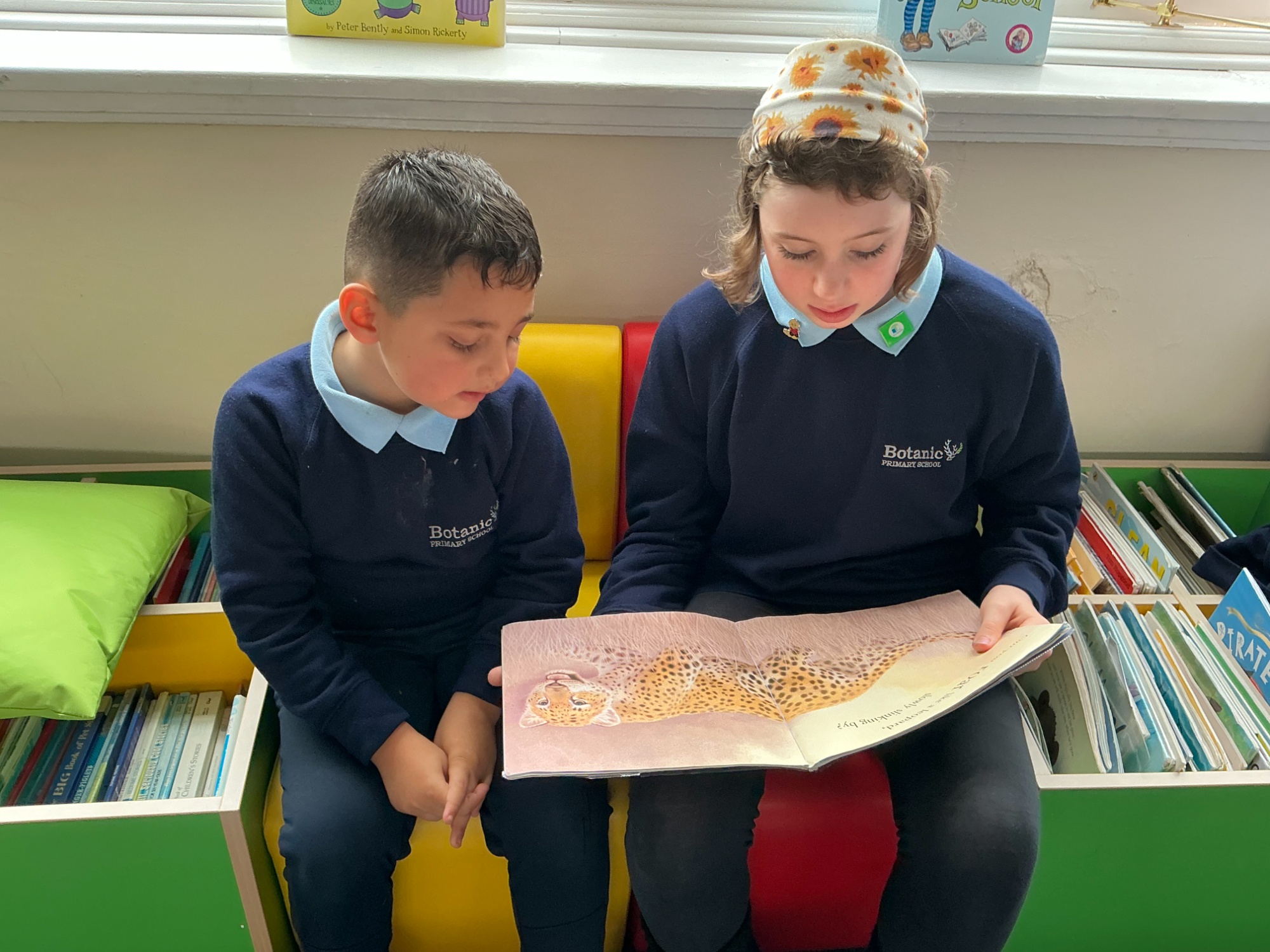 Once per half-term, we meet with our reading partners. The older pupils read to our younger pupils in the library.  This is a special time to share a book and make new friends.