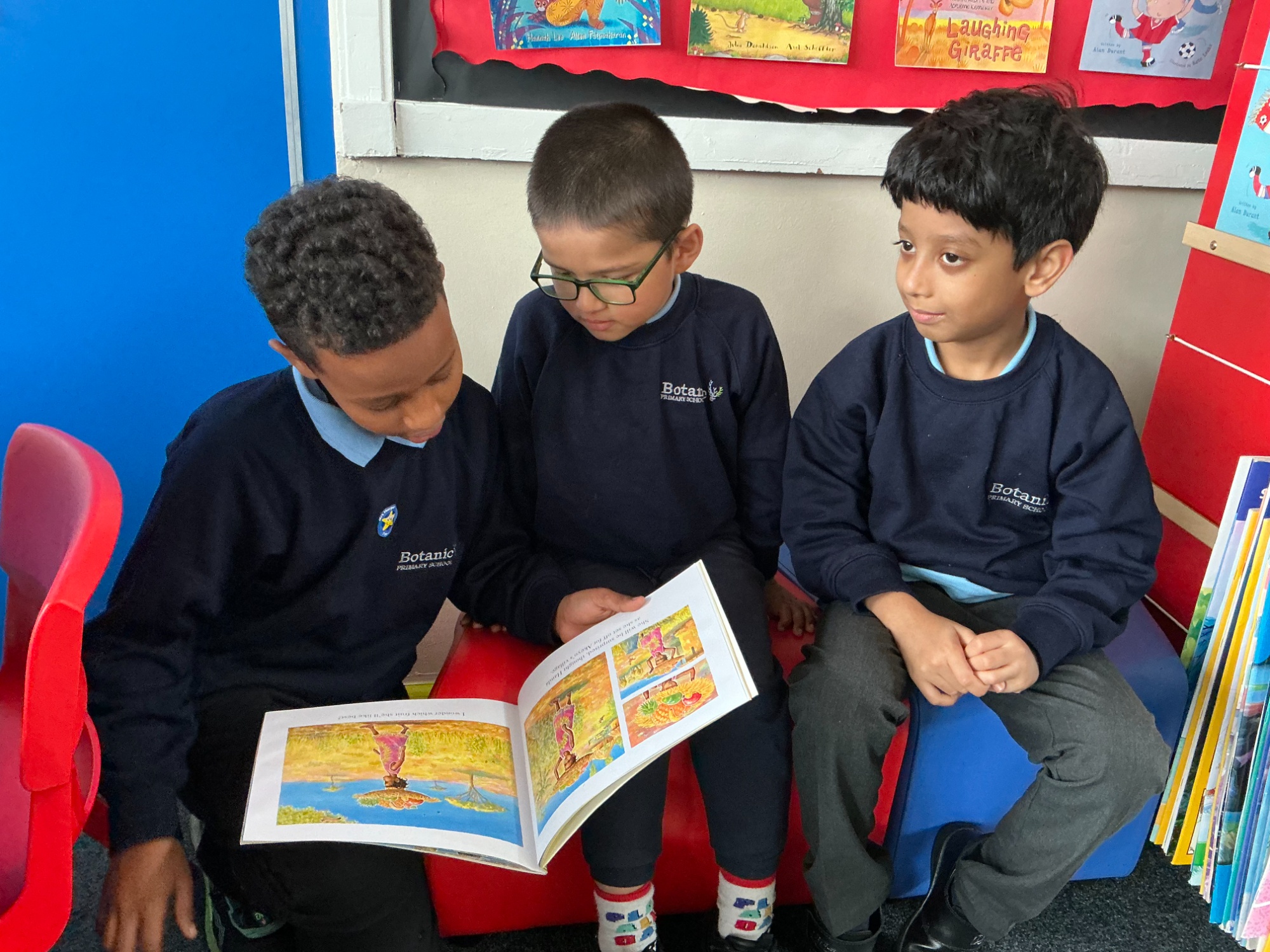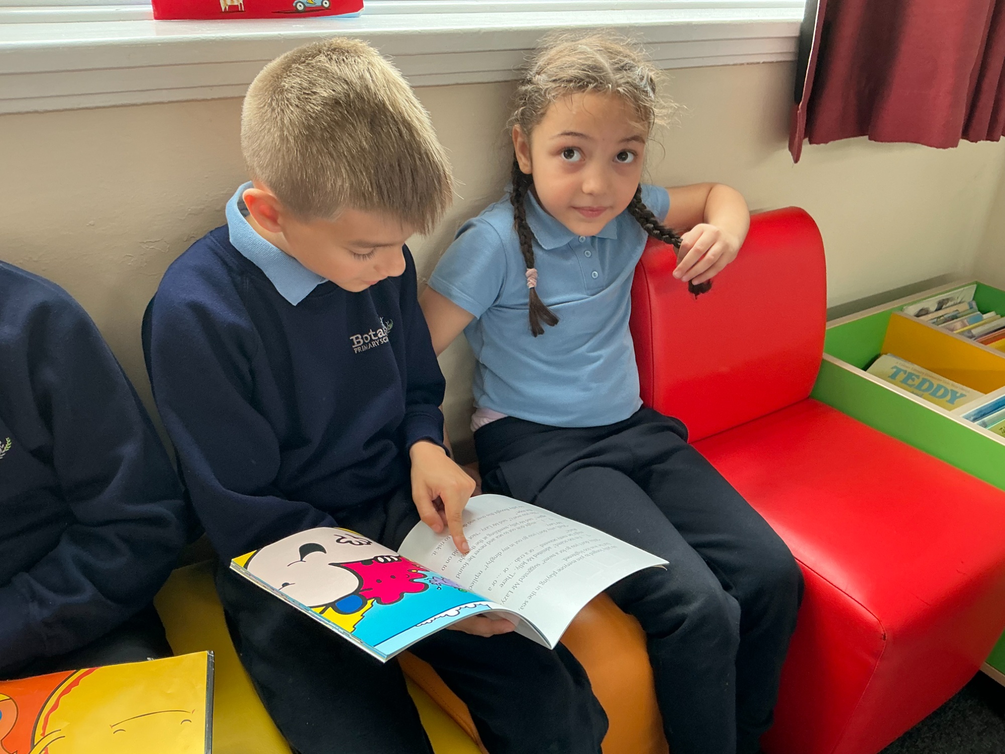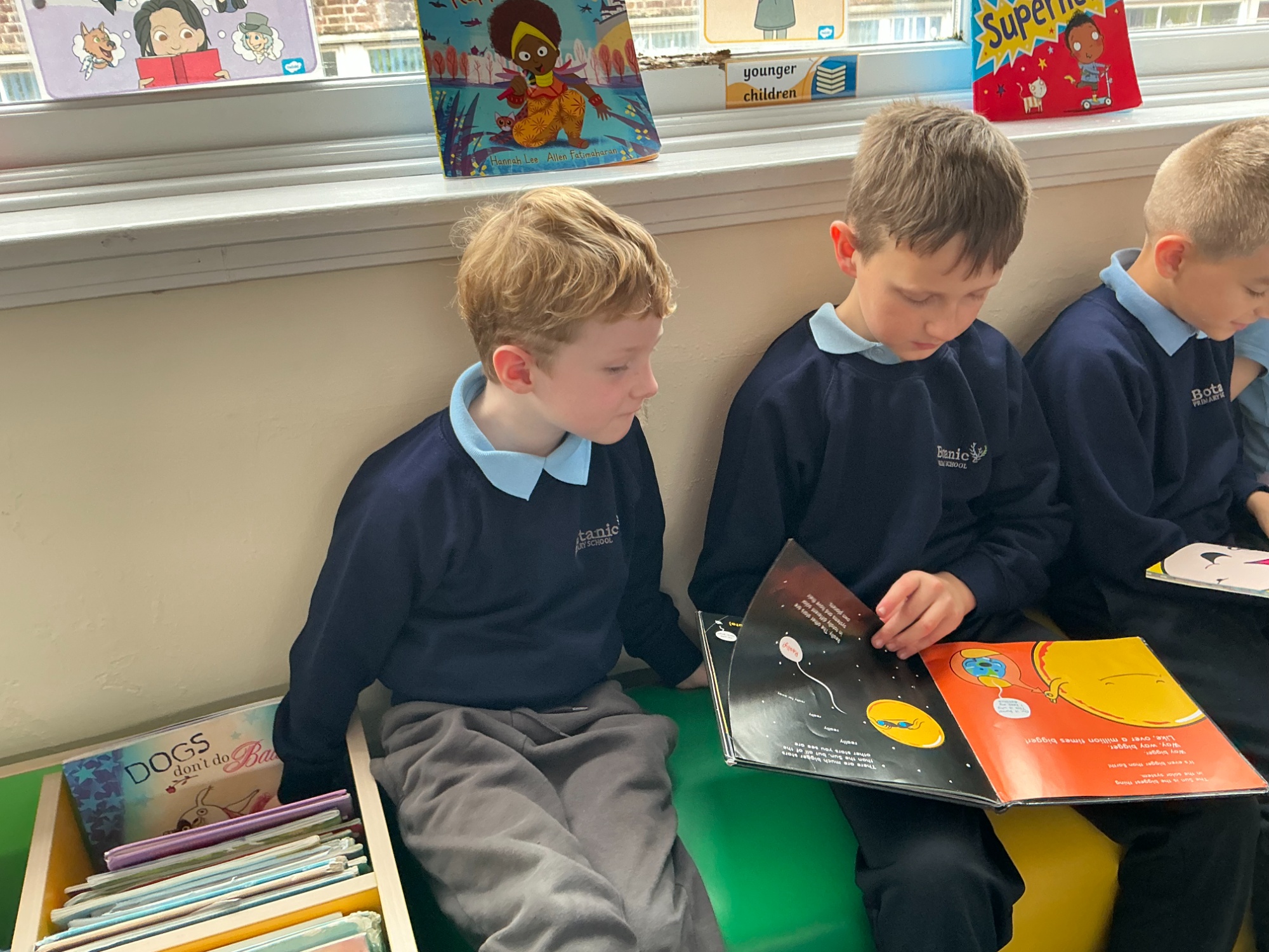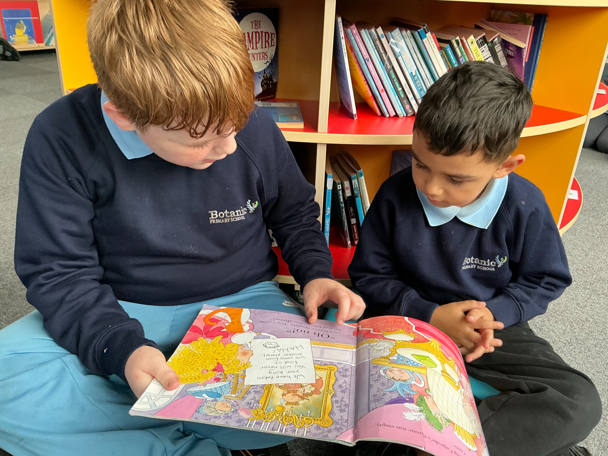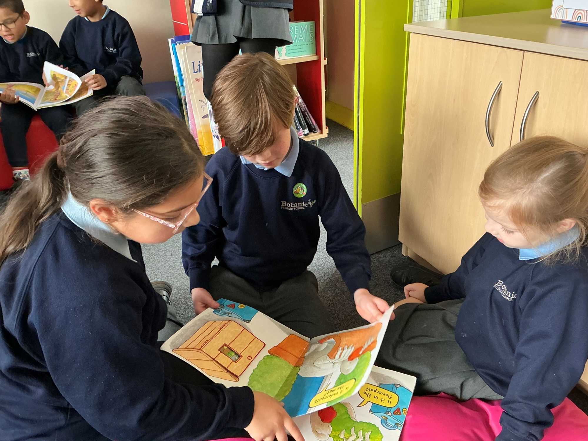 Once per half-term, we meet with our reading partners. The older pupils read to our younger pupils in the library.  This is a special time to share a book and make new friends.
